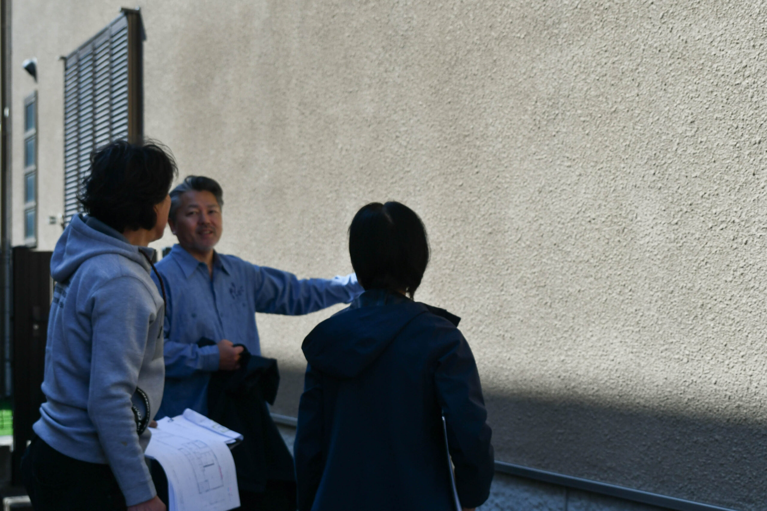 外装屋さんが外壁を、水道屋さんが水道管の点検口をチェックしています。